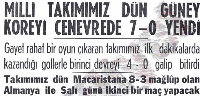 1 1954 dünya kupası gruplarında oynadığımız ve 7-0 kazandığımız maçtır. golleri; suat mamat(2), lefter küçükandonyadis(1), burhan sargun(3) ve erol keskin(1) atmıştır.