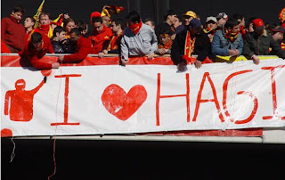 49 yasina gelmissin be hagi. sen 31 yasindaydin o zamanlar. emekli demislerdi sana. yasli diyorlardi. geldin, hirs ne demek, gençlik ne demek herkese gosterdin. bizim hayallerimizde dahi olmayan basarilar yasattin. seninle buyuduk be abi. "seni seviyorum" diyemiyorduk daha hoslandigimiz kizlara. sana bagirdik binlerle beraber "i love you hagi" diye. i love you hagi bizim haksizliklara isyanimizdi. sevgimizin en temiz, en yalin haliydi. bak simdi 18 yil gecmis o zamanlarin ustunden. afedersin essek kadar oldum. otuzlu yaslarima geldim. ama hala hep bagiriyorum ben "i love you hagi" diye. bak biz hala oradayiz. hepberaber.