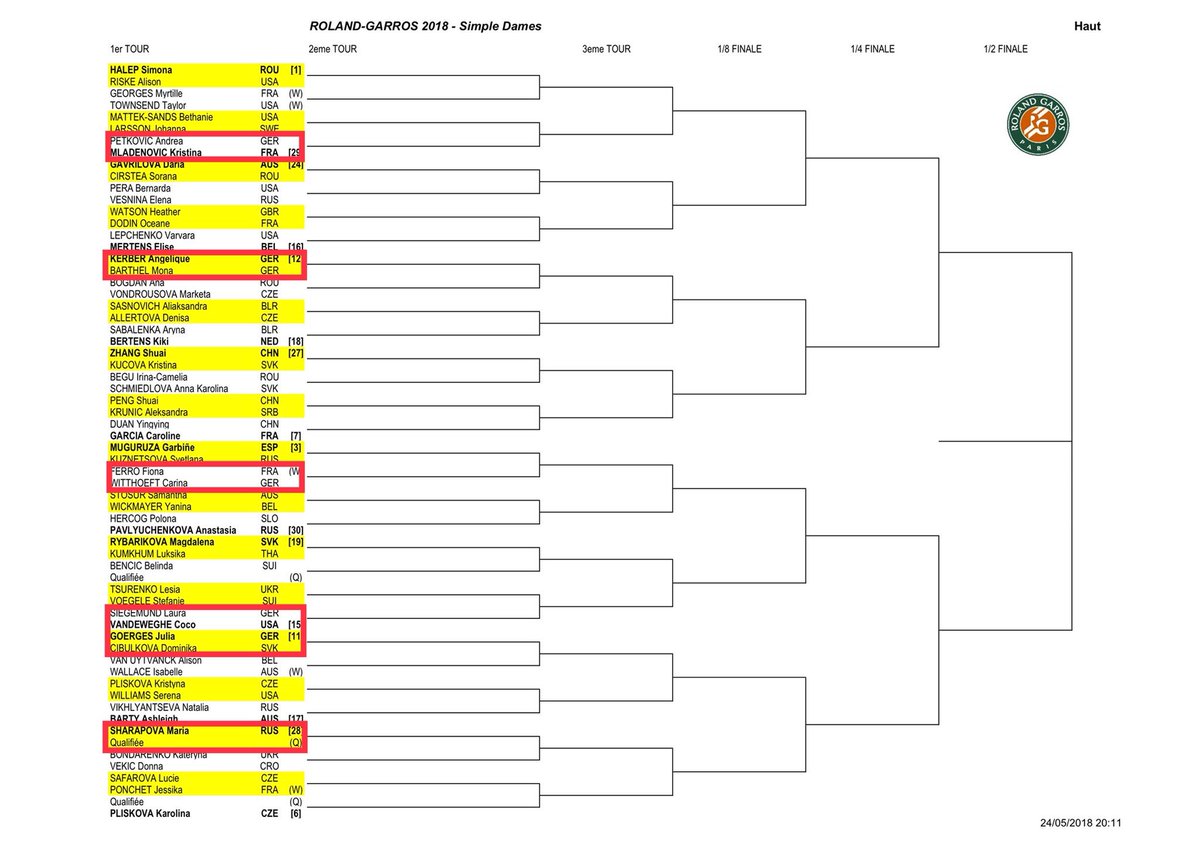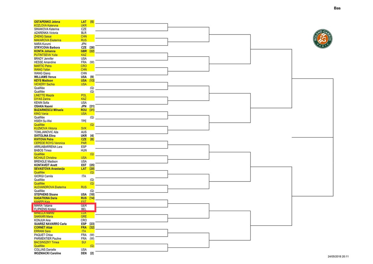 notlar: 14 aylık hamilelik arasından mart ayında dönen serena williams 453 numara olarak geldiği roland garros'ta ilk turda kristyna pliskova ile eşleşti. maria sharapova ise ilk turda elemelerden gelecek isim ile oynayacak.
